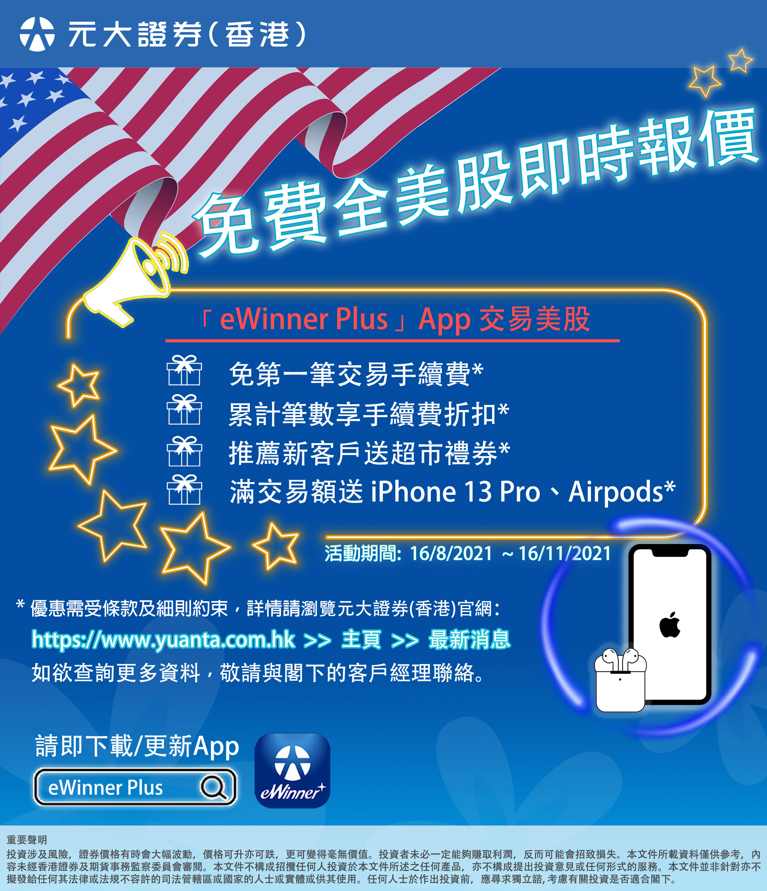 (7) 現有經紀業務部之客戶 (「推薦人」) 如於活動期間內推薦一位親友 (「被推薦人」) 成功開戶,而被推薦人透過「eWinner Plus」App應用程式成功完成5筆美股交易,推薦人可獲 HK$ 50 超市禮券。如成功推薦共 2 位親友,推薦人可獲 HK$ 100 超市禮券,如此類推。 每位合資格推薦人最高可獲取 HK$ 5,000 超市禮券推薦獎賞。被推薦人必須: